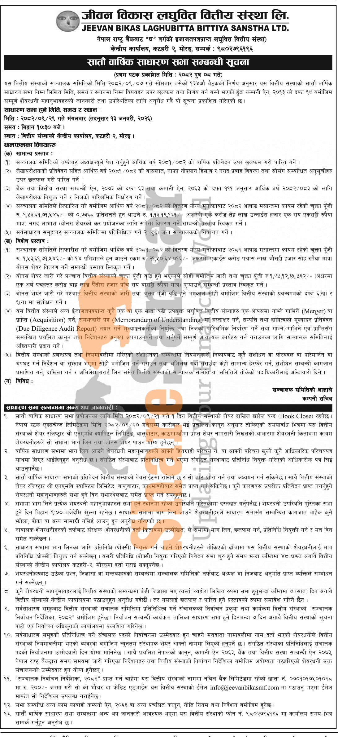 Jeevan Bikas Laghubitta Bittiya Sanstha Limited has announced its 7th AGM going to be held on 29th Poush, 2082.