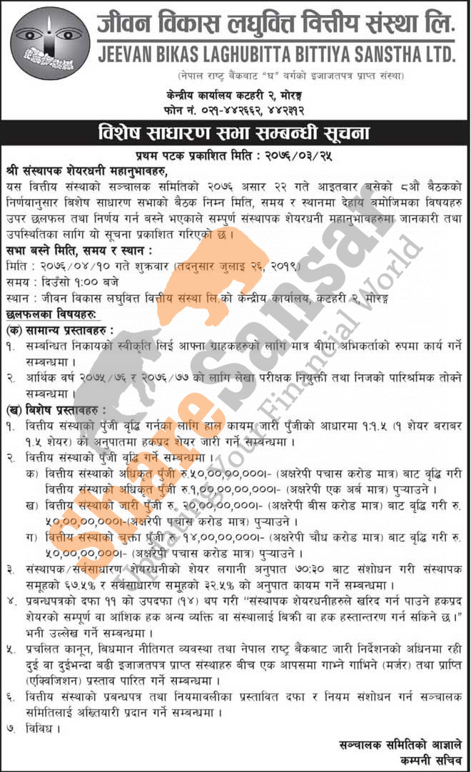 Jeevan Bikas Laghubitta Bittiya Sanstha Limited has announced its Special General Meeting going to be held on 10th Shrawan, 2076.
