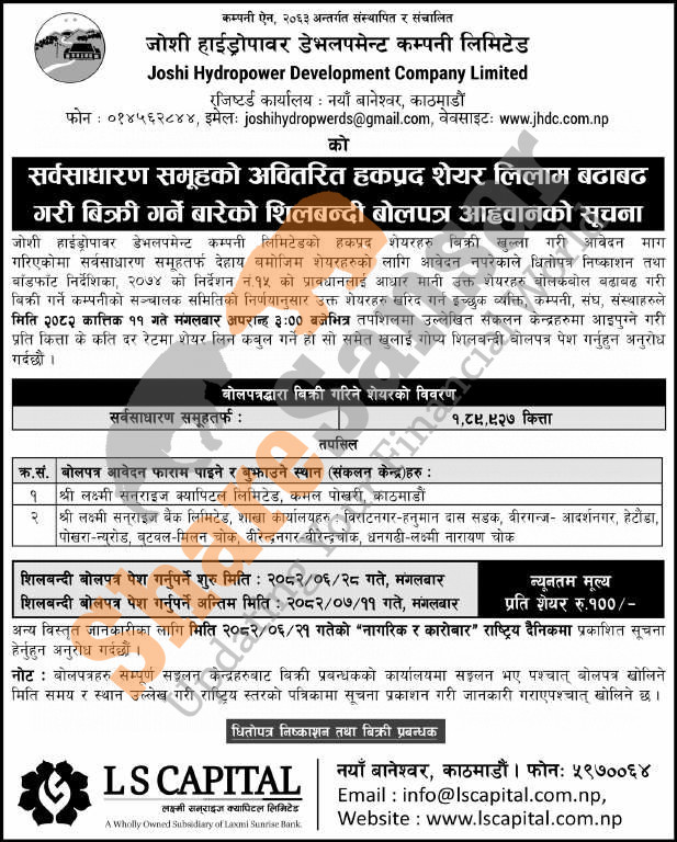 Joshi Hydropower Development Company Limited has published a deadline notice of its upcoming auction of 1,89,927 units of ordinary shares (unsold right shares) on 11th Kartik, 2082.