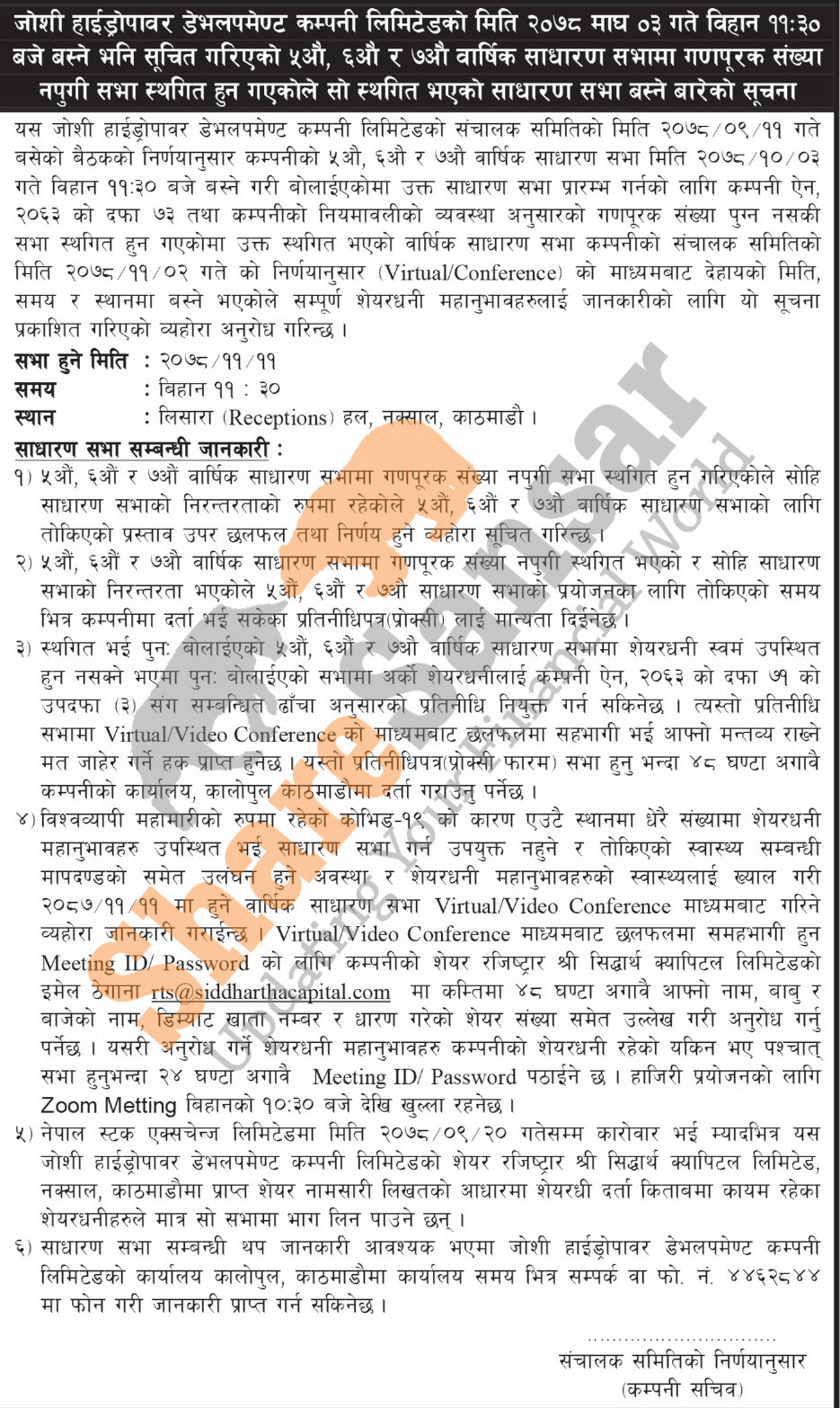Joshi Hydropower Development Company Limited has re-announced its 5th, 6th and 7th AGM going to be held on 11th Falgun, 2078.