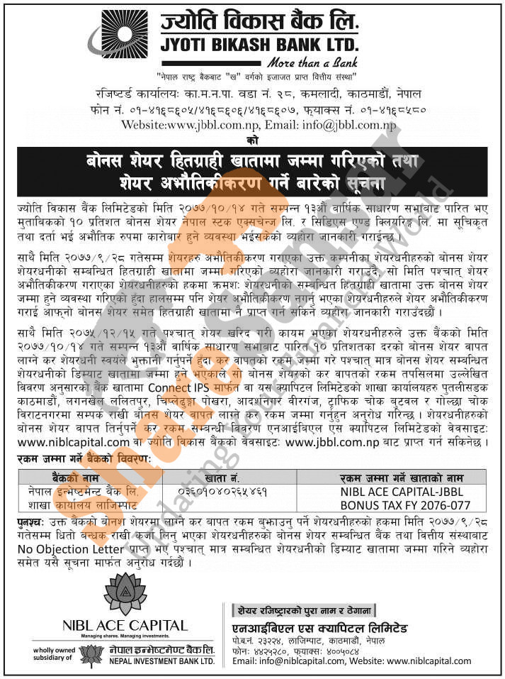 Jyoti Bikas Bank Limited has distributed 10% bonus shares directly to DEMAT accounts of its shareholders and has urged to dematerialize their shares.
