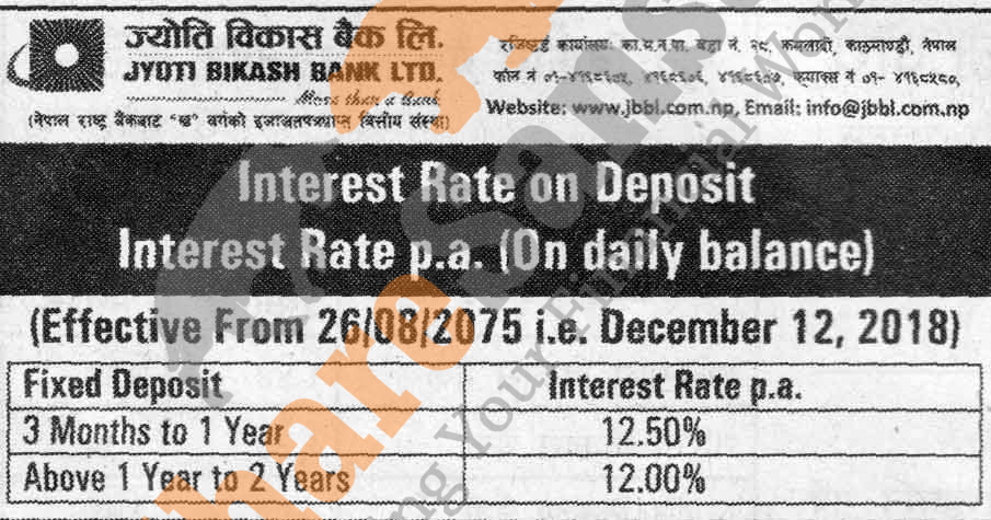 Jyoti Bikas Bank Limited has published a notice regarding new interest rate and its effective from 26th Mangsir, 2075.