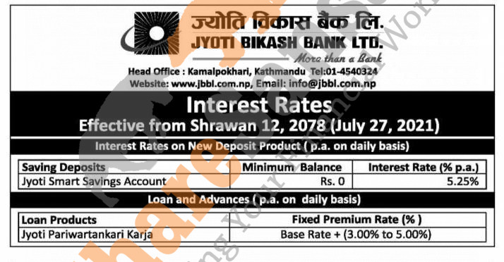 Jyoti Bikas Bank Limited has published a notice regarding the new interest rate for deposit and loan products and it's effective from 12th Shrawan, 2078.