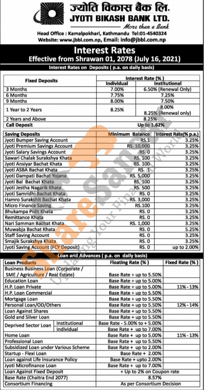 Jyoti Bikas Bank Limited has published a notice regarding the new interest rate for deposit and loan products and it's effective from 1st Shrawan, 2078.