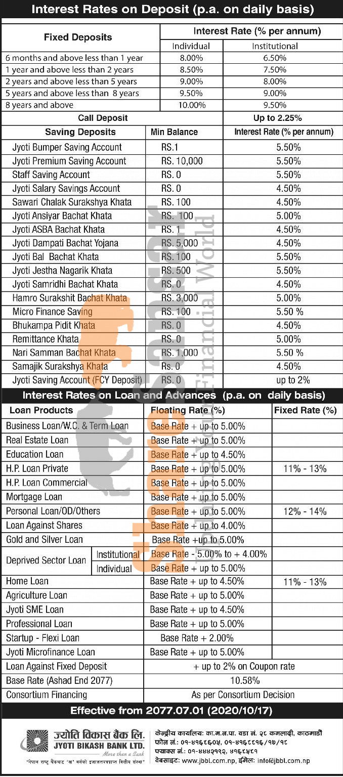 Jyoti Bikas Bank Limited has published a notice regarding the new interest rate for its loan and deposit products and it's effective from 1st Kartik, 2077.
