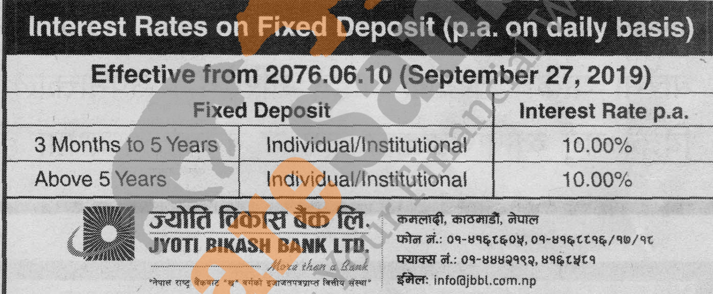 Jyoti Bikash Bank Limited has published a notice regarding new interest rate and its effective from 10th Ashwin, 2076.