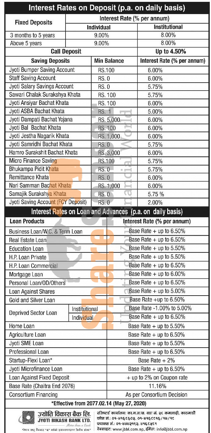 Jyoti Bikash Bank Limited has published a notice regarding new interest rate and its effective from 14th Jestha, 2077.