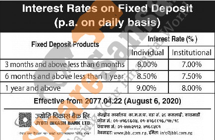 Jyoti Bikash Bank Limited has published a notice regarding new interest rate and its effective from 22nd Shrawan, 2077.