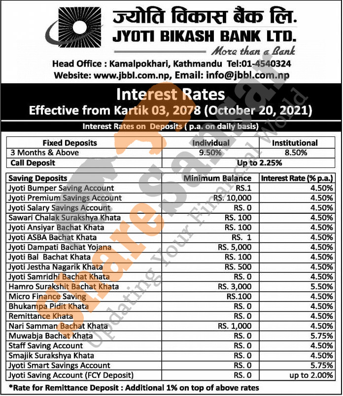 Jyoti Bikash Bank Limited has published a notice regarding new revised interest rate and it's effective from 3rd Kartik, 2078.