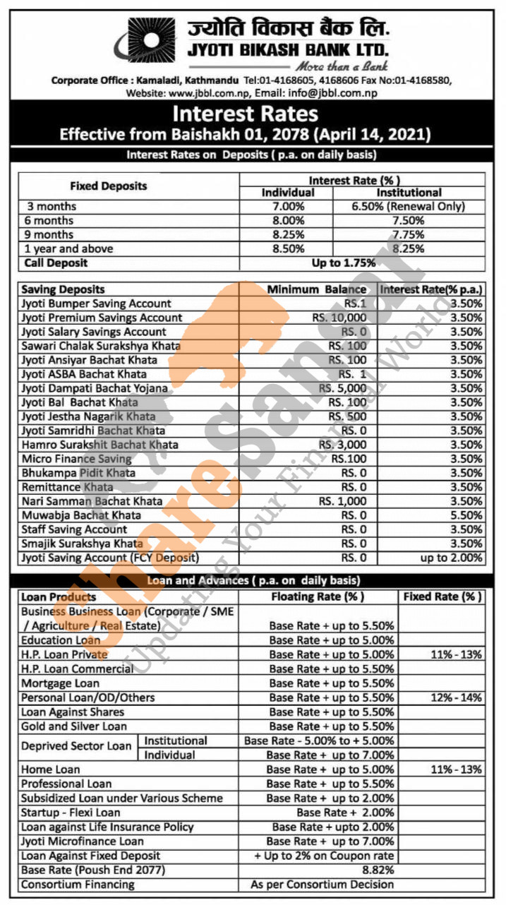 Jyoti Bikash Bank Limited has published a notice regarding the new interest rate for deposit and loan products and it's effective from 1st Baisakh, 2078.