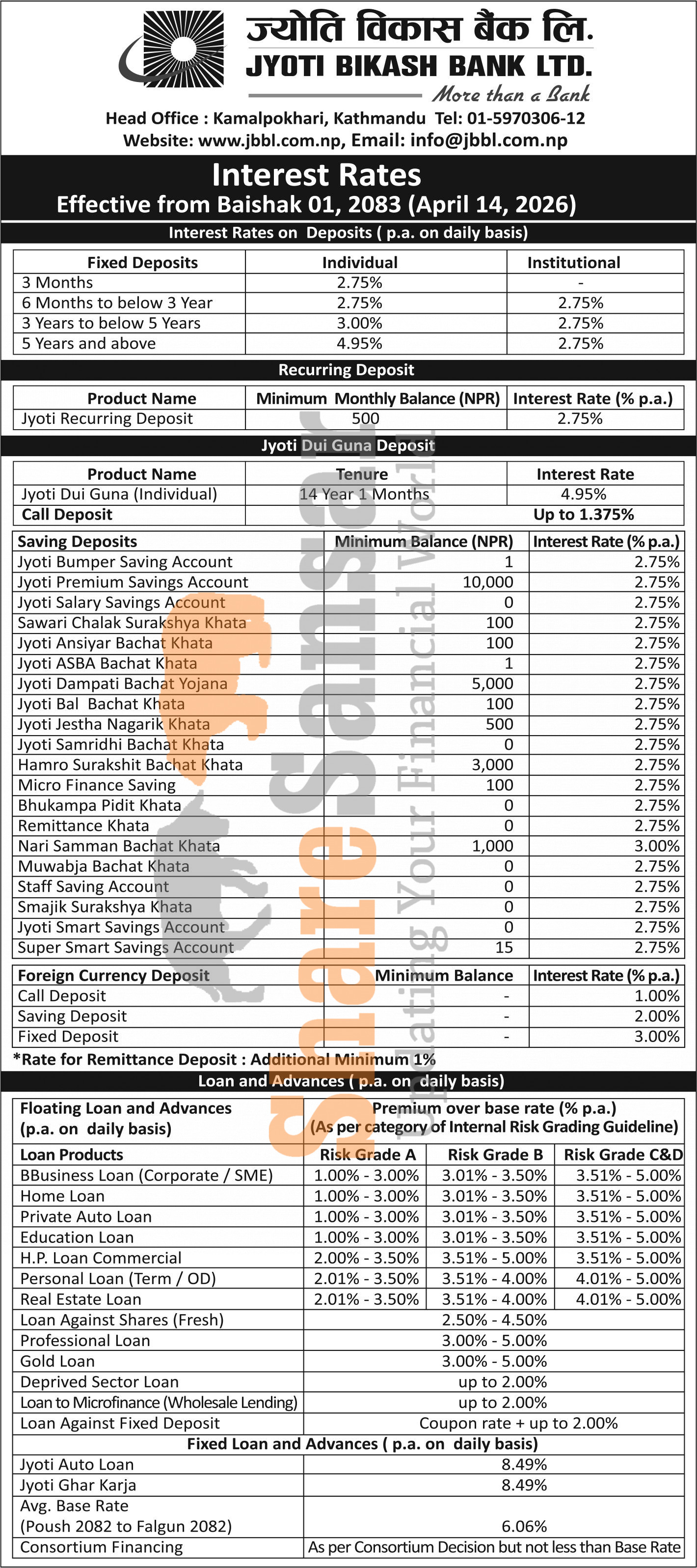 Jyoti Bikash Bank Limited has published a notice regarding the new interest rate for deposit and loan products and it's effective from 1st Baisakh, 2083.