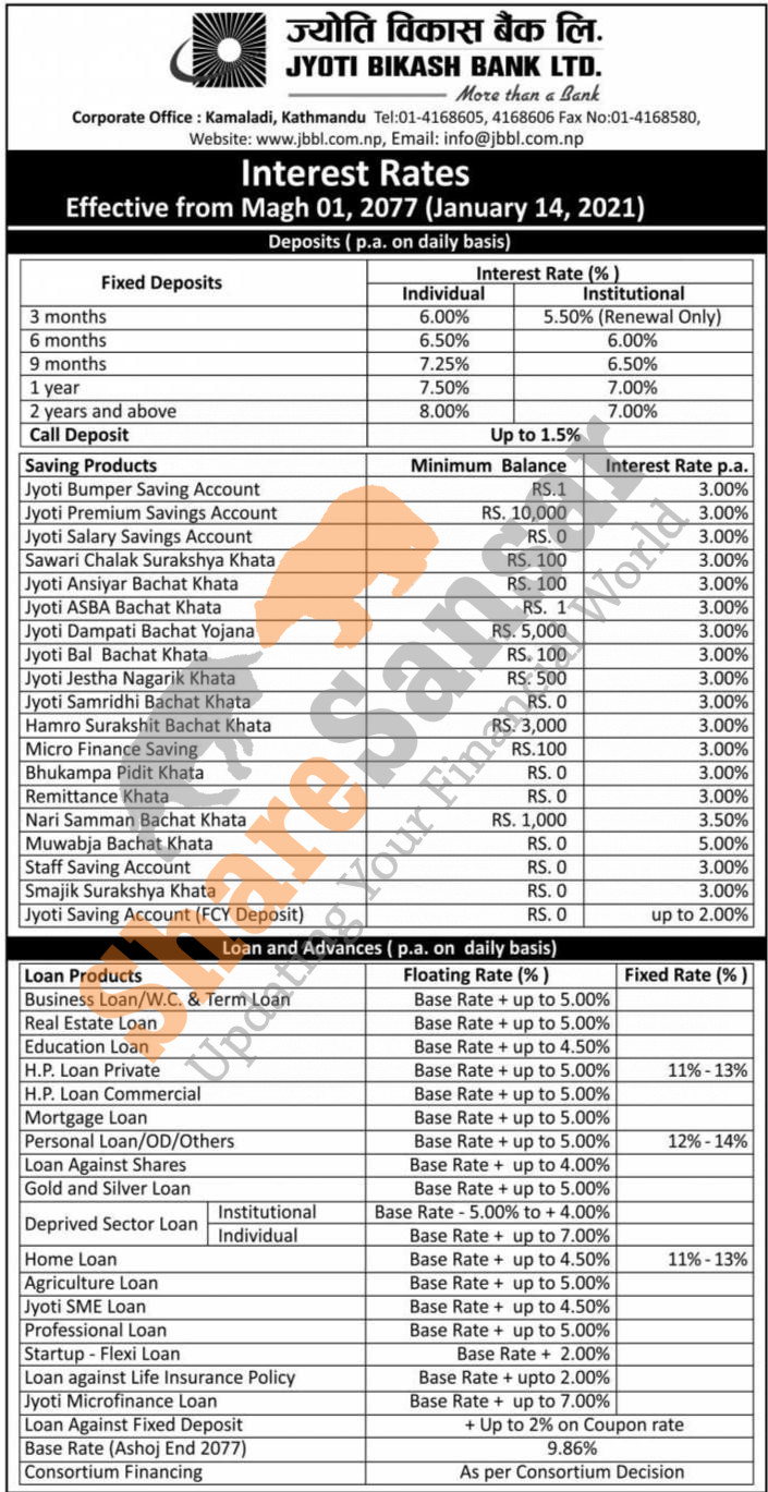Jyoti Bikash Bank Limited has published a notice regarding the new interest rate for deposit and loan products and it's effective from 1st Magh, 2077.