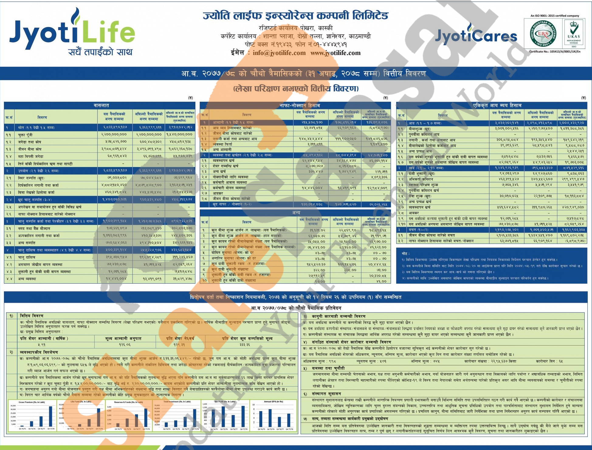 Jyoti Life Insurance company Limited has posted a net profit of Rs 130.01 million and published its 4th quarter company analysis of the fiscal year 2077/78.