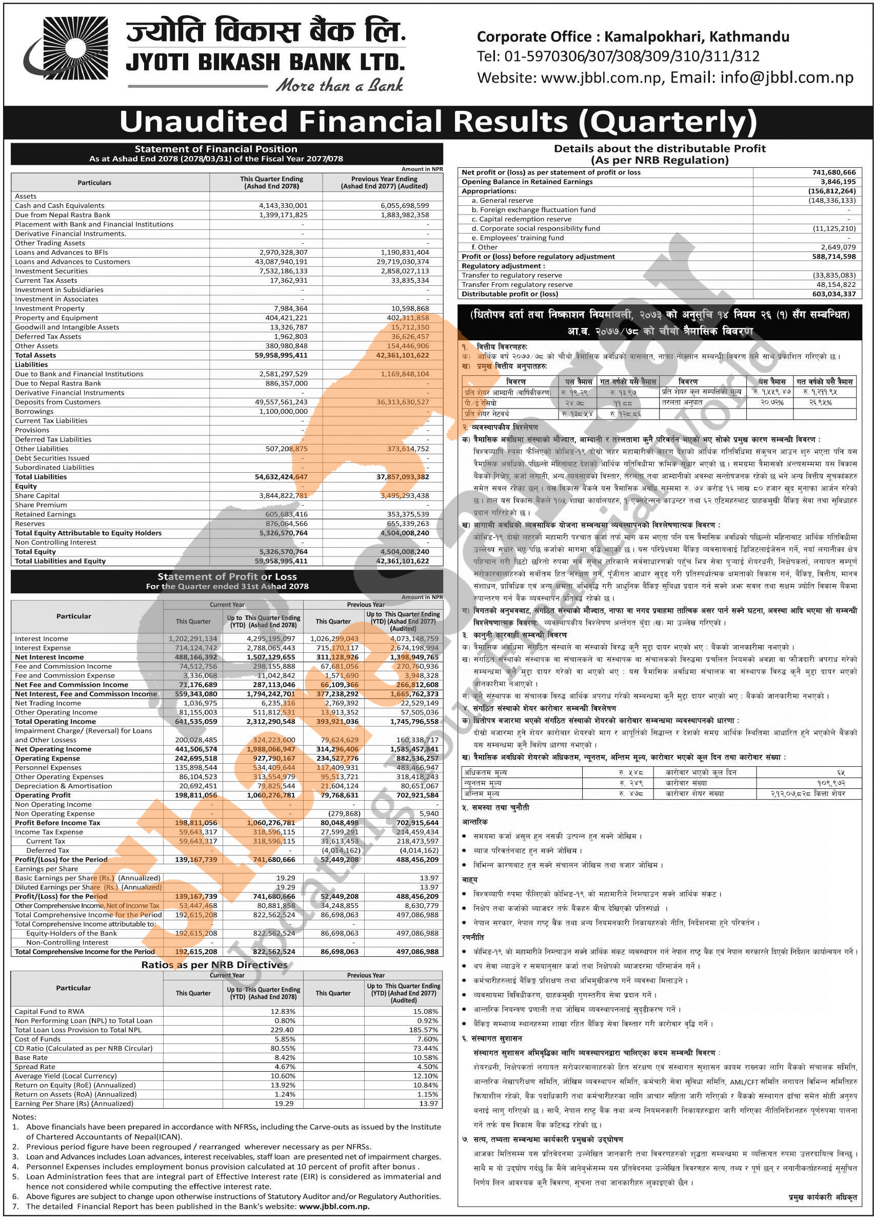 Jyoti Bikash Bank Limited has posted a net profit of Rs 741.68 million and published its 4th quarter company analysis of the fiscal year 2077/78.