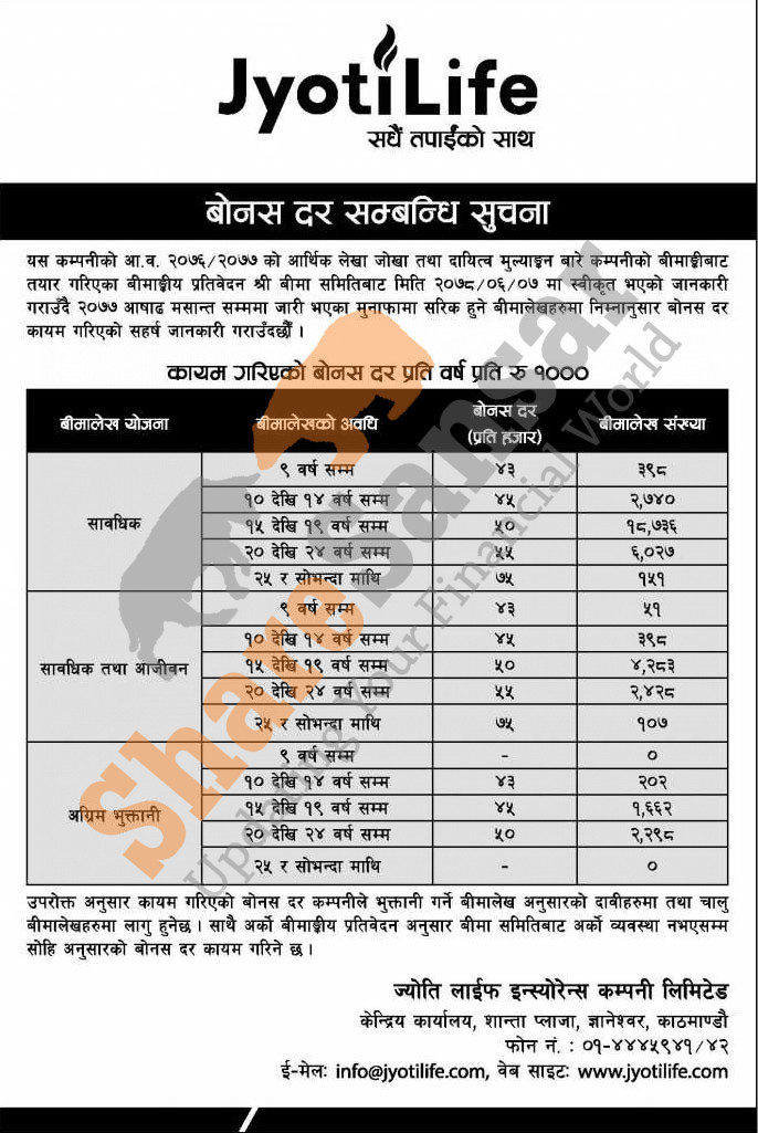Jyoti Life Insurance Company Limited has published a notice regarding a new bonus rate for its different life insurance policies.
