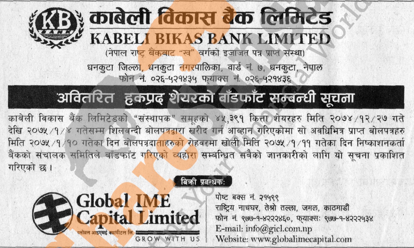 Kabeli Bikas Bank Limited has allotted its 45,391 units promoter shares in auction to general public on 11th Baisakh, 2075.