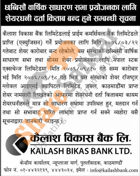 Kailash Bikas Bank Limited has published a book closure date for its 26th AGM on (10th Poush, 2076).