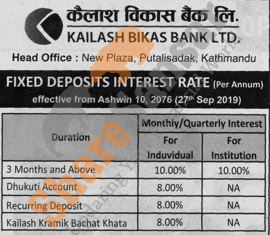 Kailash Bikas Bank Limited has published a notice regarding new interest rate and its effective from 10th Ashwin, 2076.