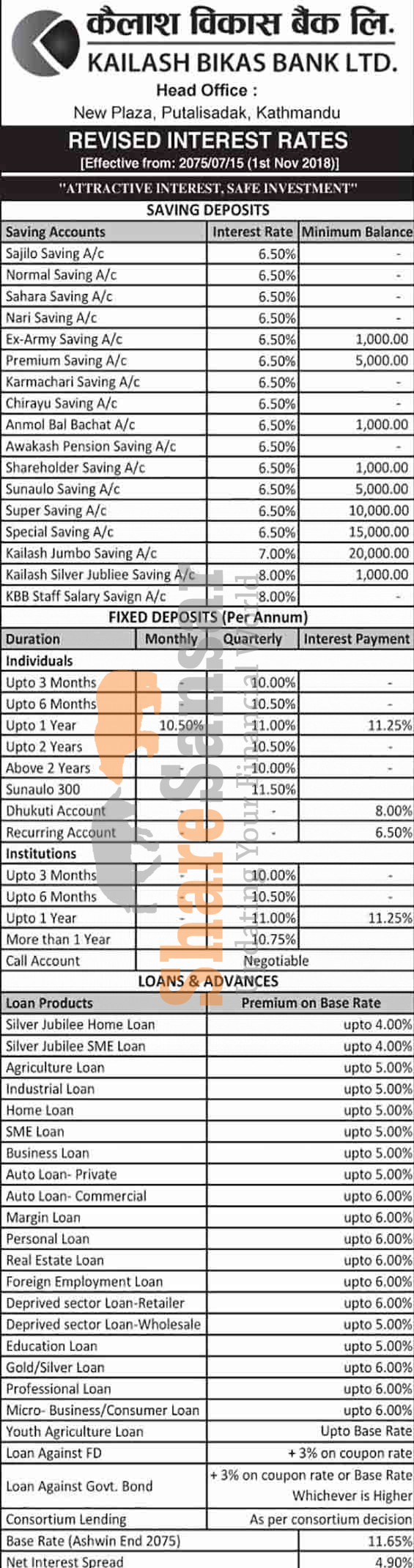 Kailash Bikas Bank Limited has published a notice regarding new interest rate and its effective from 15th Kartik, 2075.