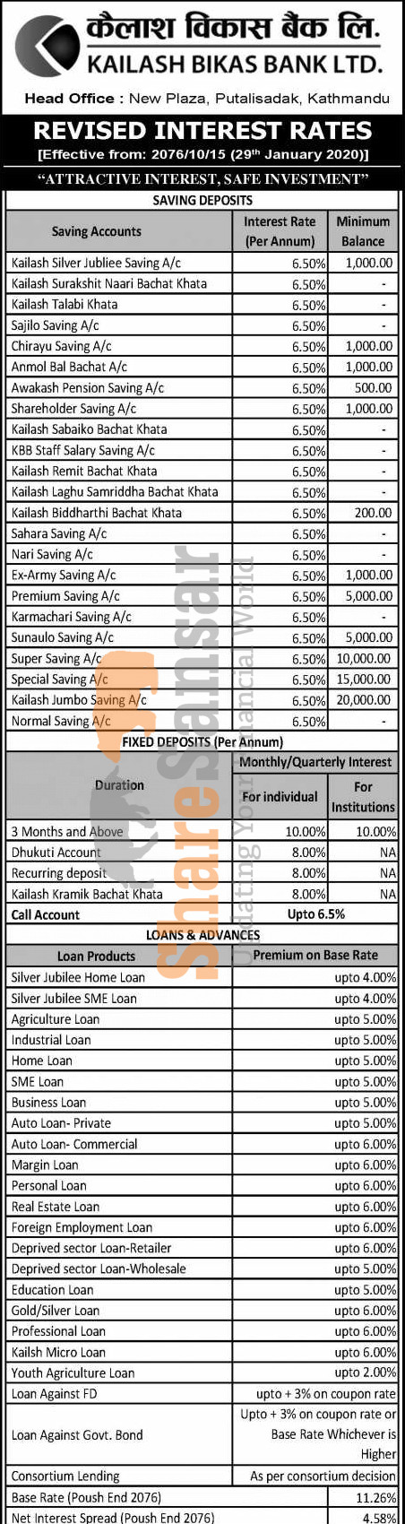 Kailash Bikas Bank Limited has published a notice regarding new interest rate and its effective from 15th Magh, 2076.