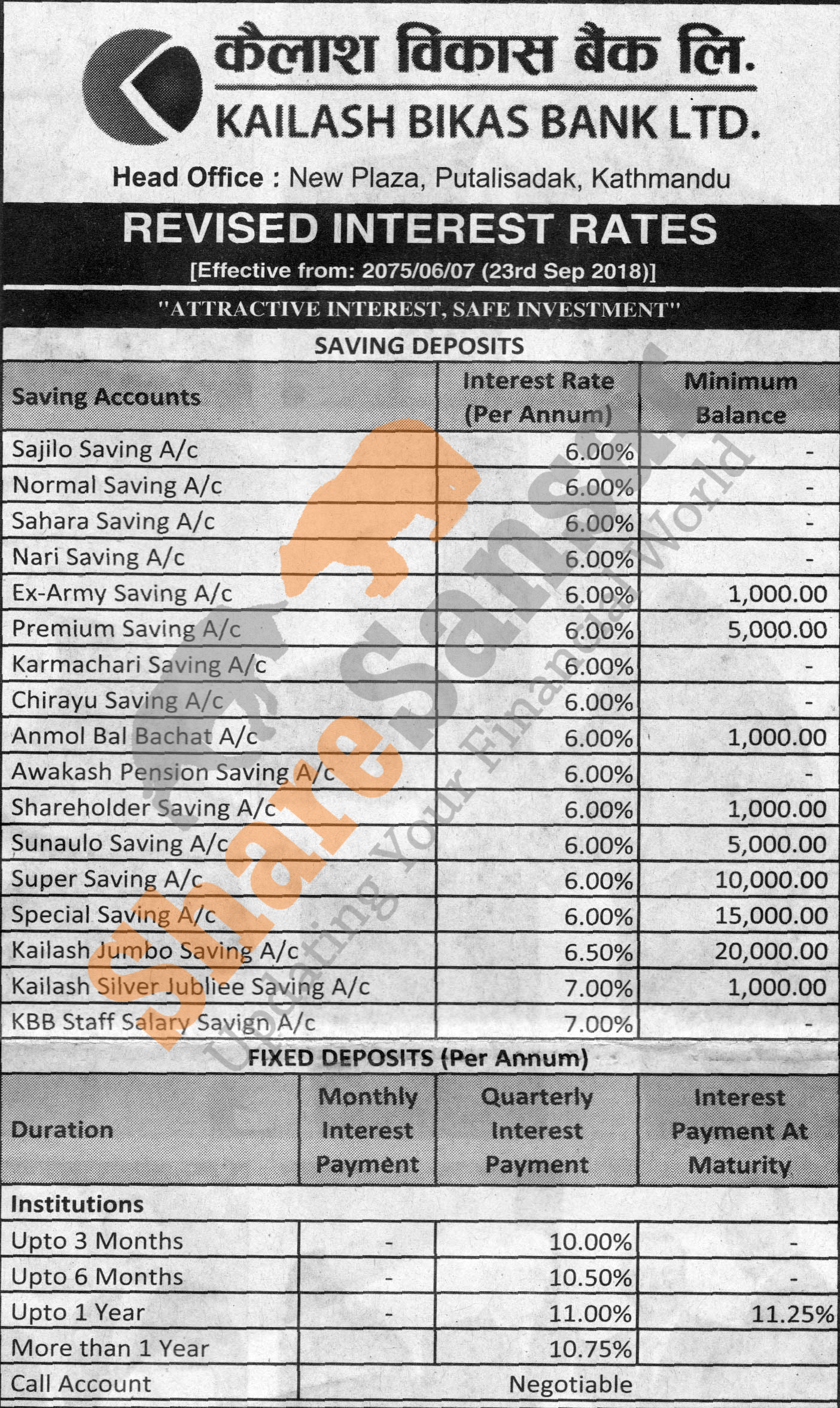 Kailash Bikas Bank Limited has published a notice regarding new interest rate and its effective from 7th ashwin, 2075.