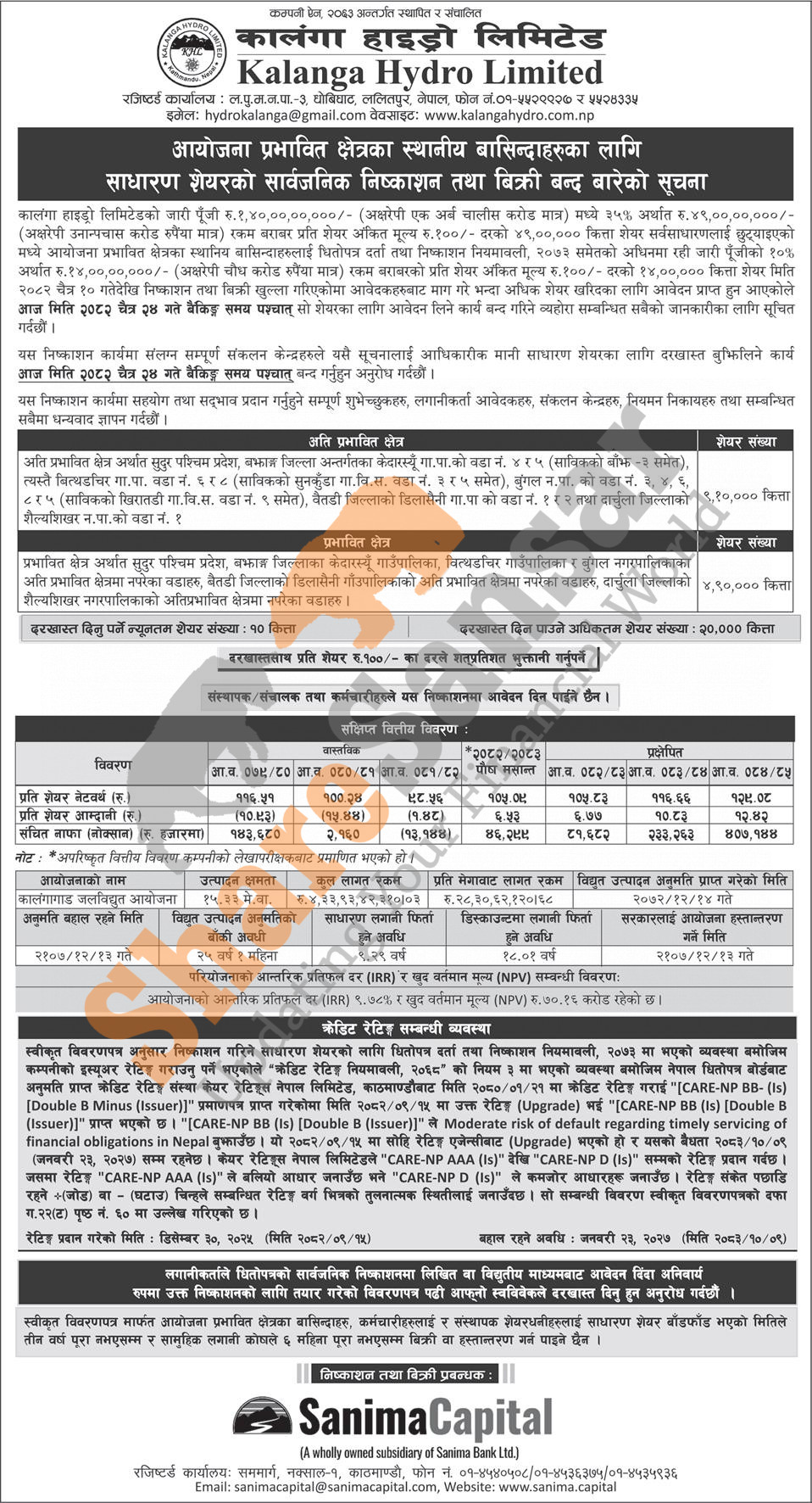 Kalanga Hydro Limited is closing its 14,00,000 units IPO shares to the project-affected locals of Bajhang District from today (24th Chaitra, 2082).
