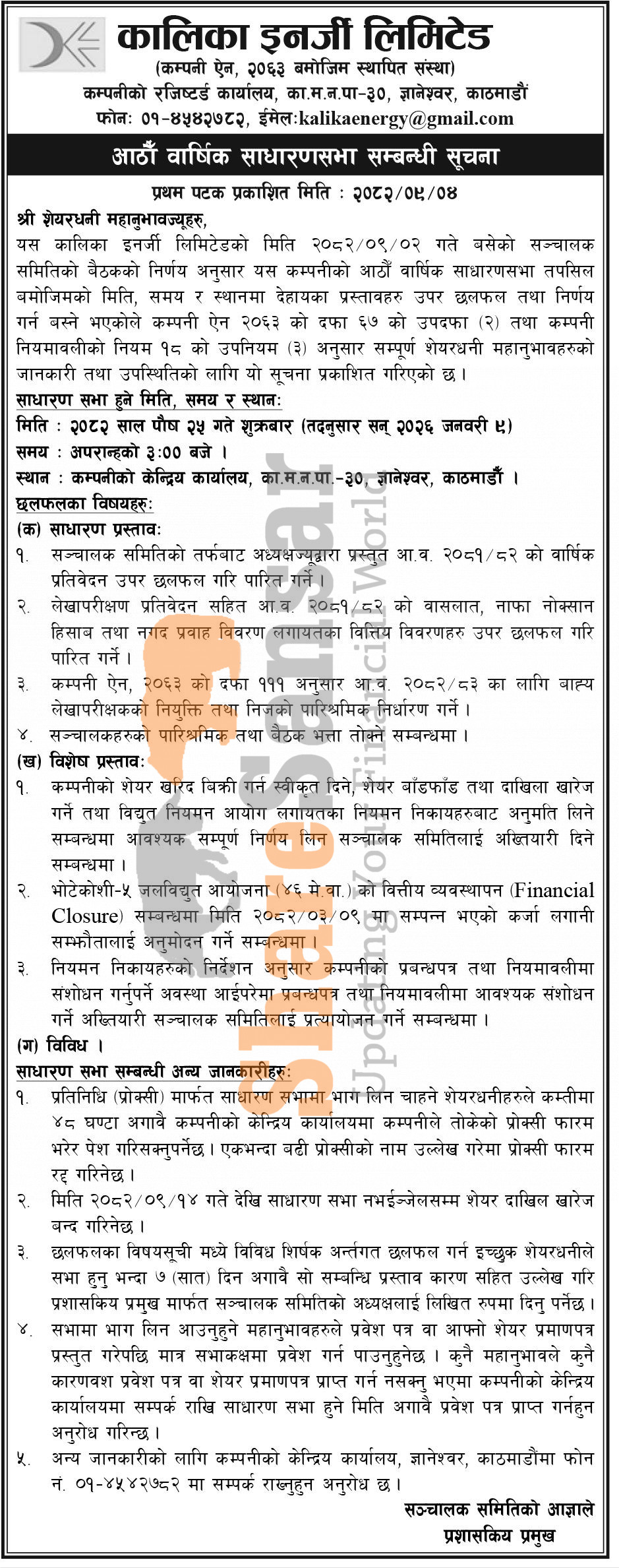 Kalika Energy Limited has announced its 8th AGM going to be held on 25th Poush, 2082.