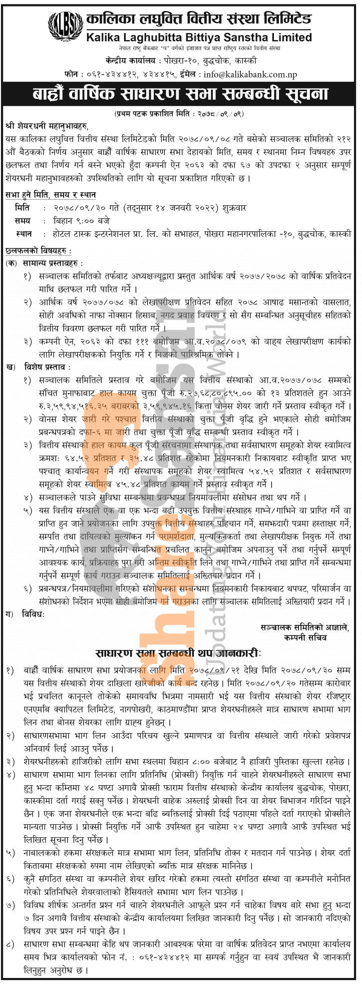 Kalika Laghubitta Bittiya Sanstha Limited has announced its 12th AGM going to be held on 30th Poush, 2078.