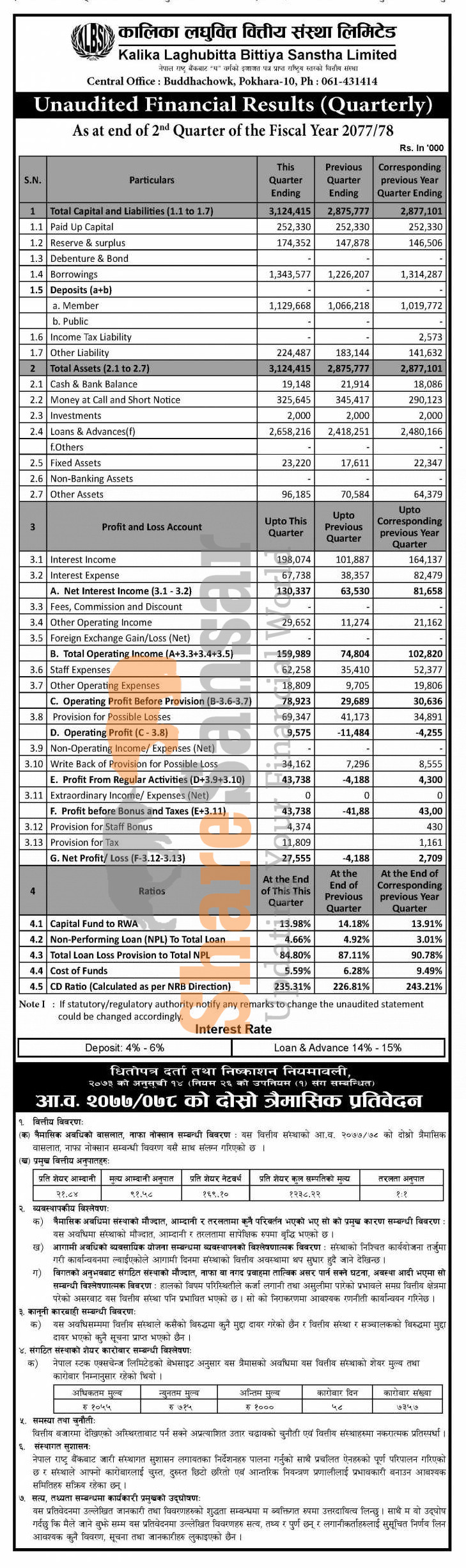 Kalika Laghubitta Bittiya Sanstha Limited has posted a net profit of Rs 27.55 million and published its 2nd quarter company analysis of the fiscal year 2077/78.