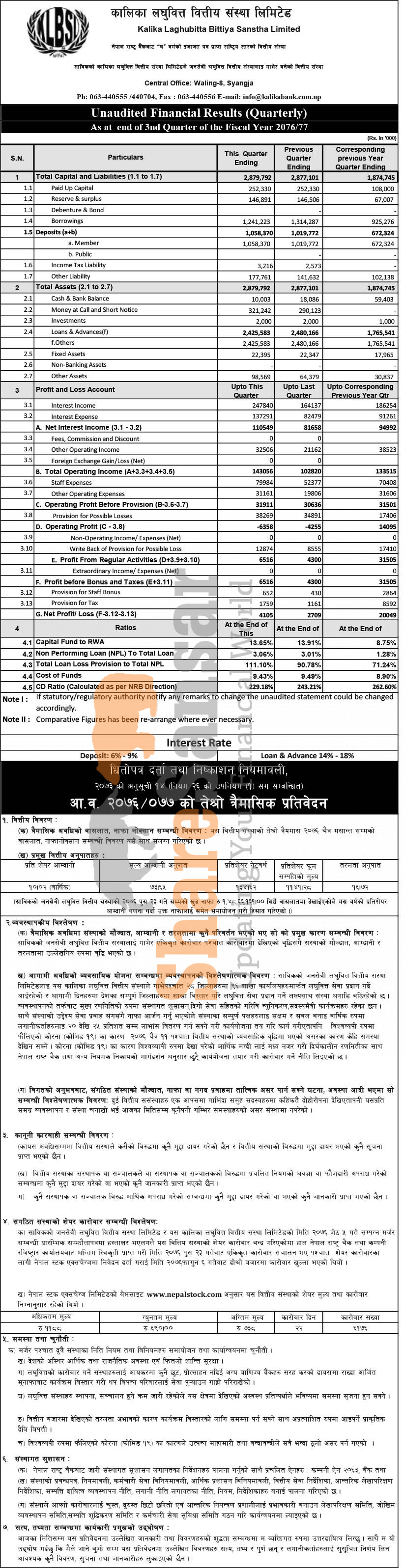 Kalika Laghubitta Bittiya Sanstha Limited has posted a net profit of Rs 4.10 million and published its 3rd quarter company analysis of the fiscal year 2076/77.