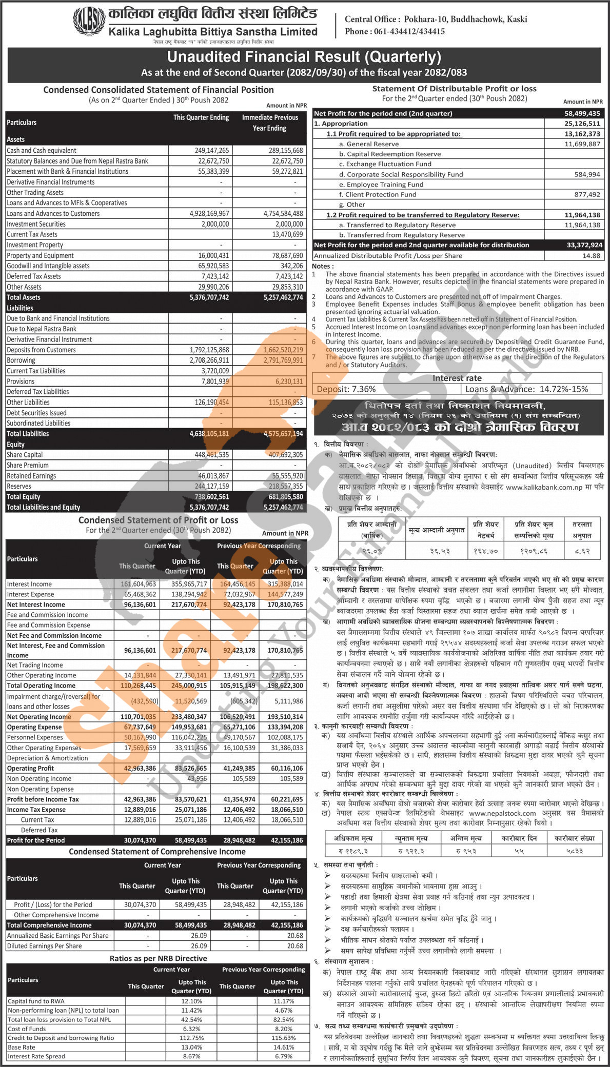 Kalika Laghubitta Bittiya Sanstha Limited has posted a net profit of Rs 58.49 million and published its 2nd quarter company analysis of the fiscal year 2082/83.