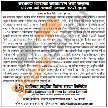 Kalika Laghubitta Bittiya Sanstha Limited has published a notice to its promoter shareholders regarding the conversion of the share structure ratio.
