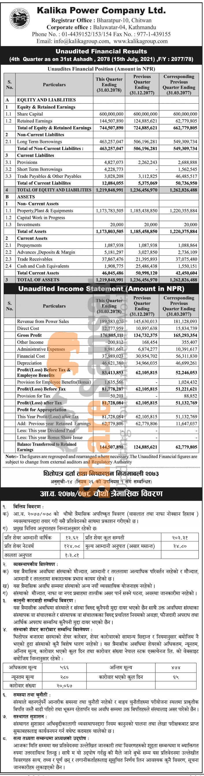 Kalika Power Company Limited has posted a net profit of Rs 81.72 million and published its 4th quarter company analysis of the fiscal year 2077/78.