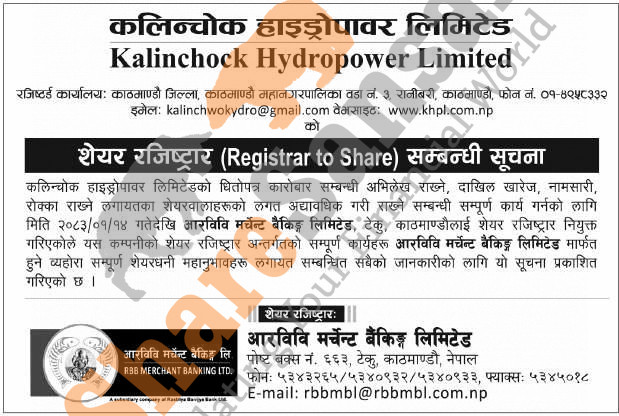 Kalinchowk Hydropower Limited has appointed RBB Merchant Banking Limited as its share registrar.