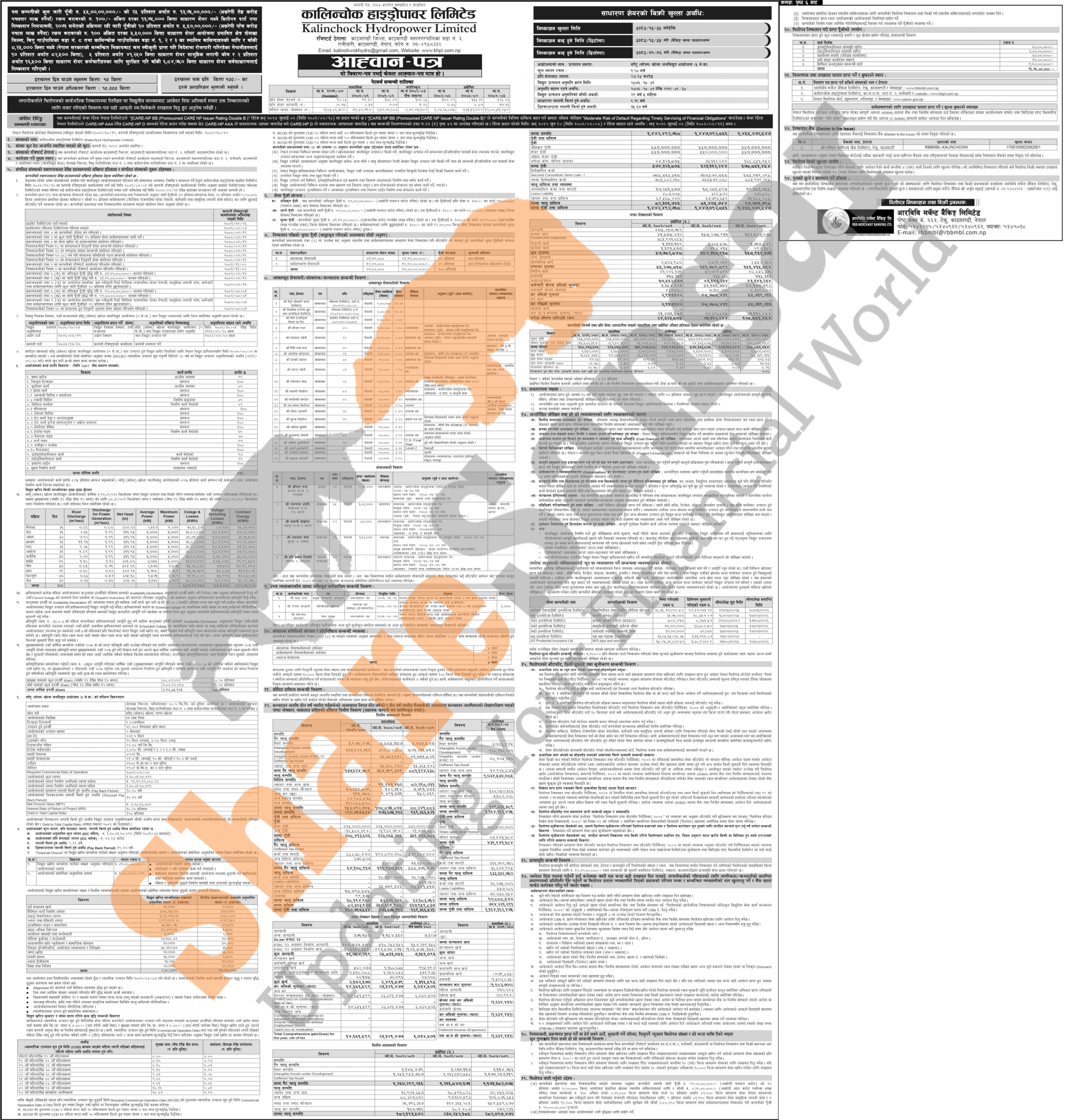 Kalinchowk Hydropower Limited has published an offer letter to issue 6,84,750 units IPO shares to the general public from 22nd Chaitra to 25th Chaitra, 2082.