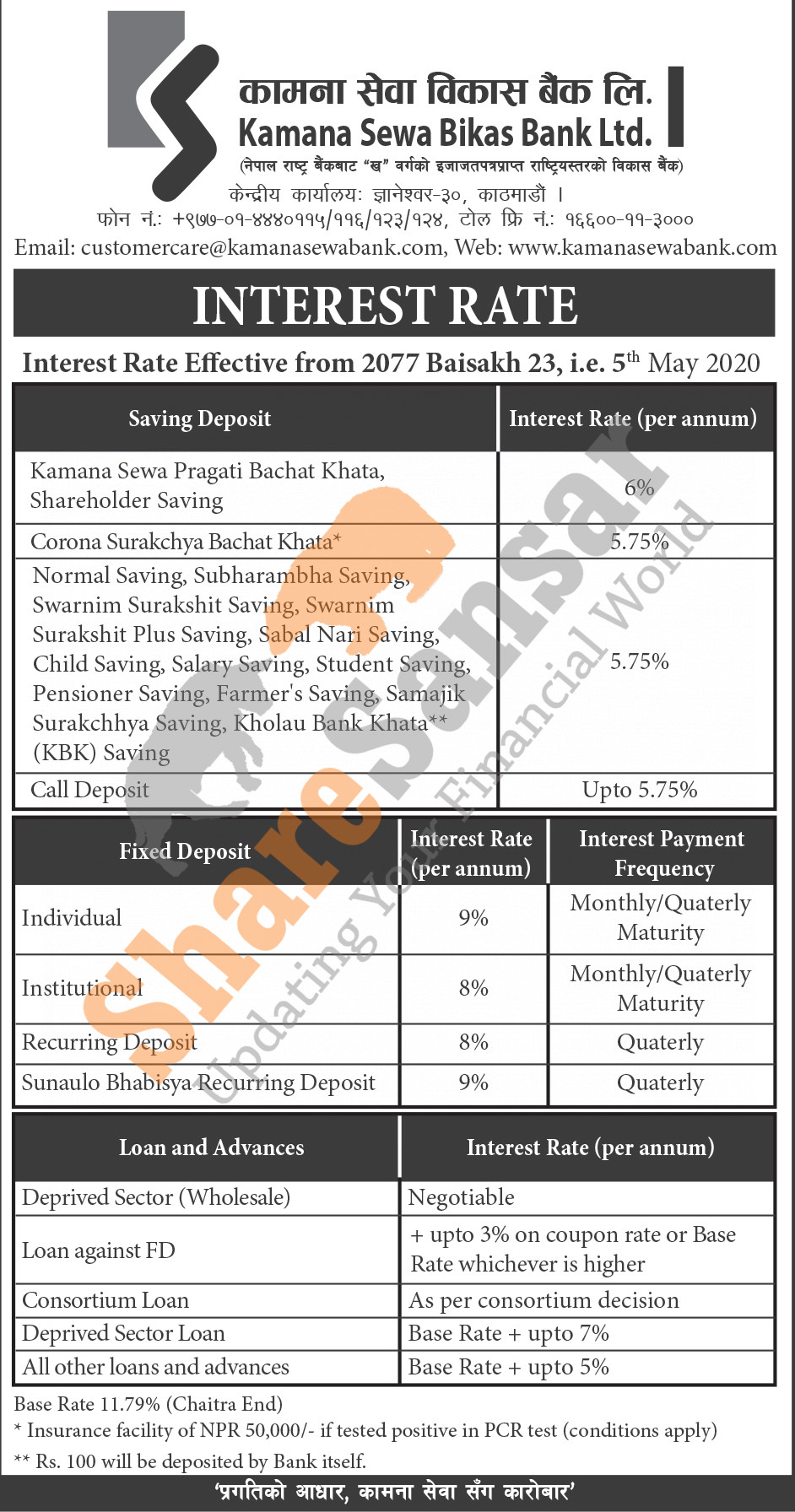 Kamana Sewa Bank Limited has published a notice regarding new interest rate and its effective from 23rd Baishakh, 2077.