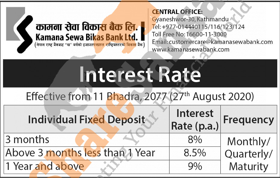 Kamana Sewa Bank Limited has published a notice regarding the new interest rate for its deposit and loan products and its effective from 11th Bhadra, 2077.