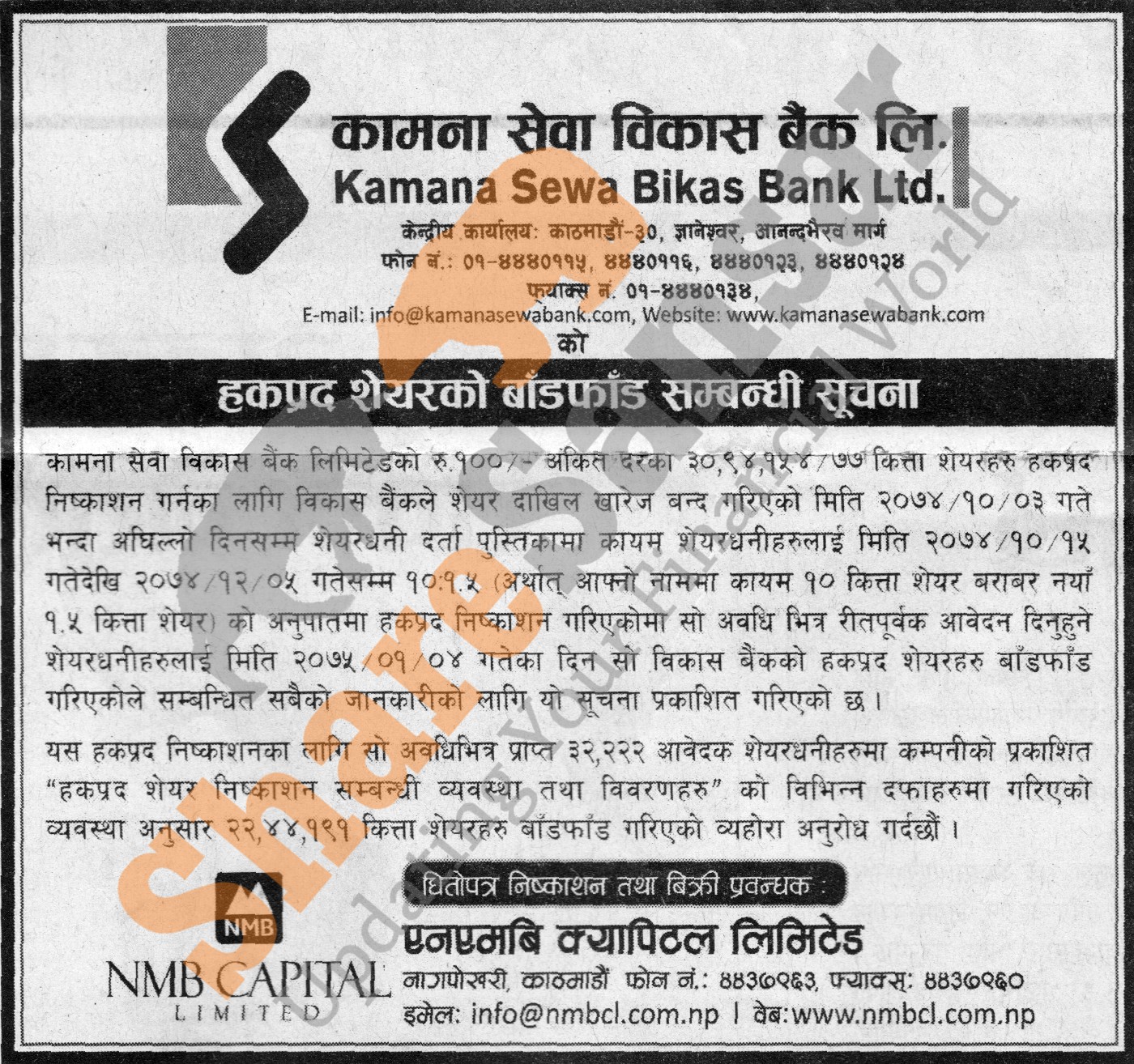 Kamana Sewa Bikas Bank Limited has allotted its 10:1.5 ratio right shares to its shareholders on 4th Baishakh, 2075.