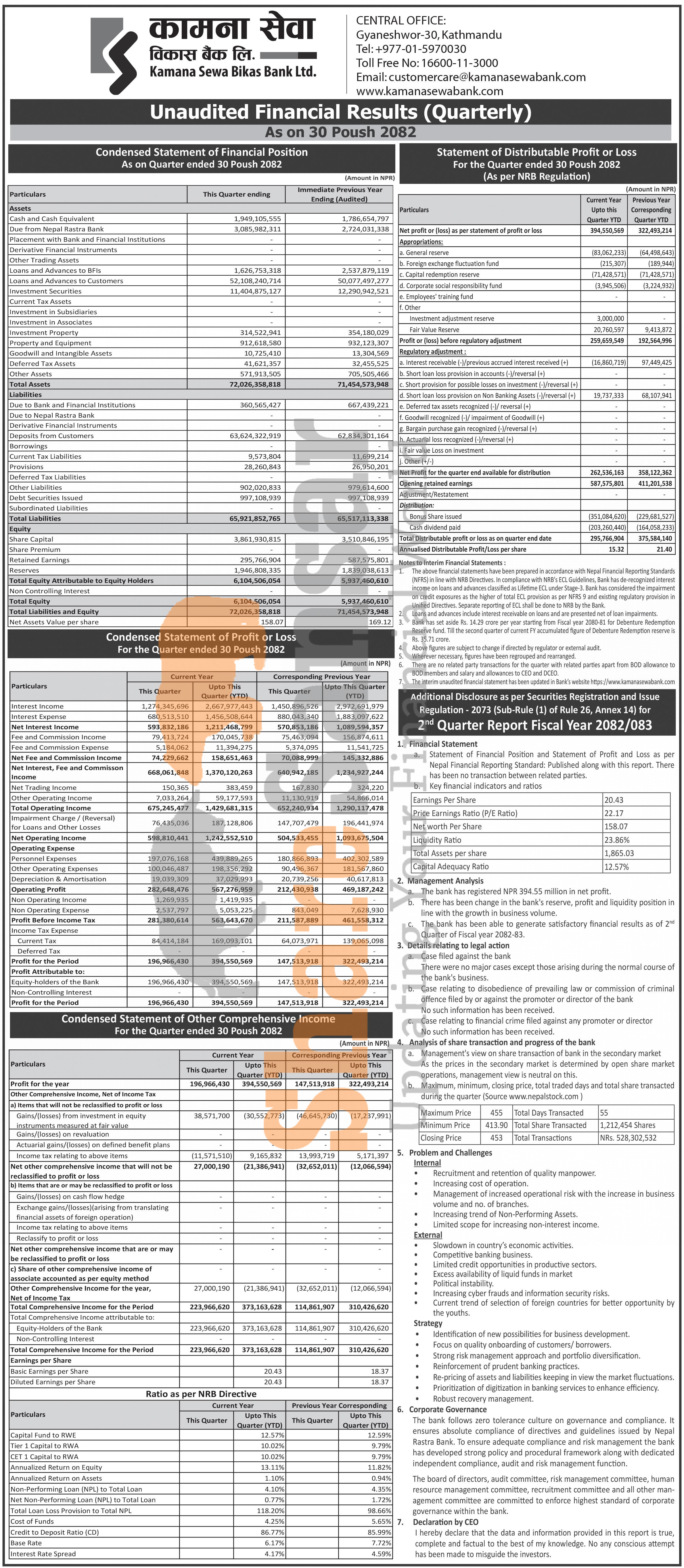 Kamana Sewa Bikas Bank Limited has posted a net profit of Rs 394.55 million and published its 2nd quarter company analysis of the fiscal year 2082/83.