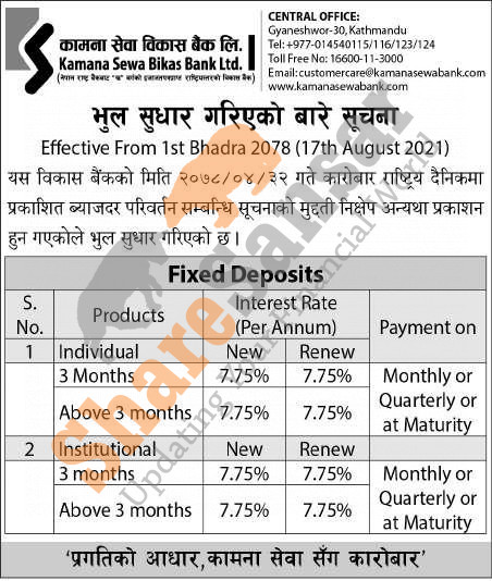 Kamana Sewa Bikas Bank Limited has published a notice regarding correction on its interest rate .