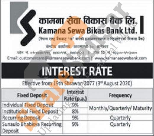 Kamana Sewa Bikas Bank Limited has published a notice regarding new interest rate and its effective from 19th Shrawan, 2077.
