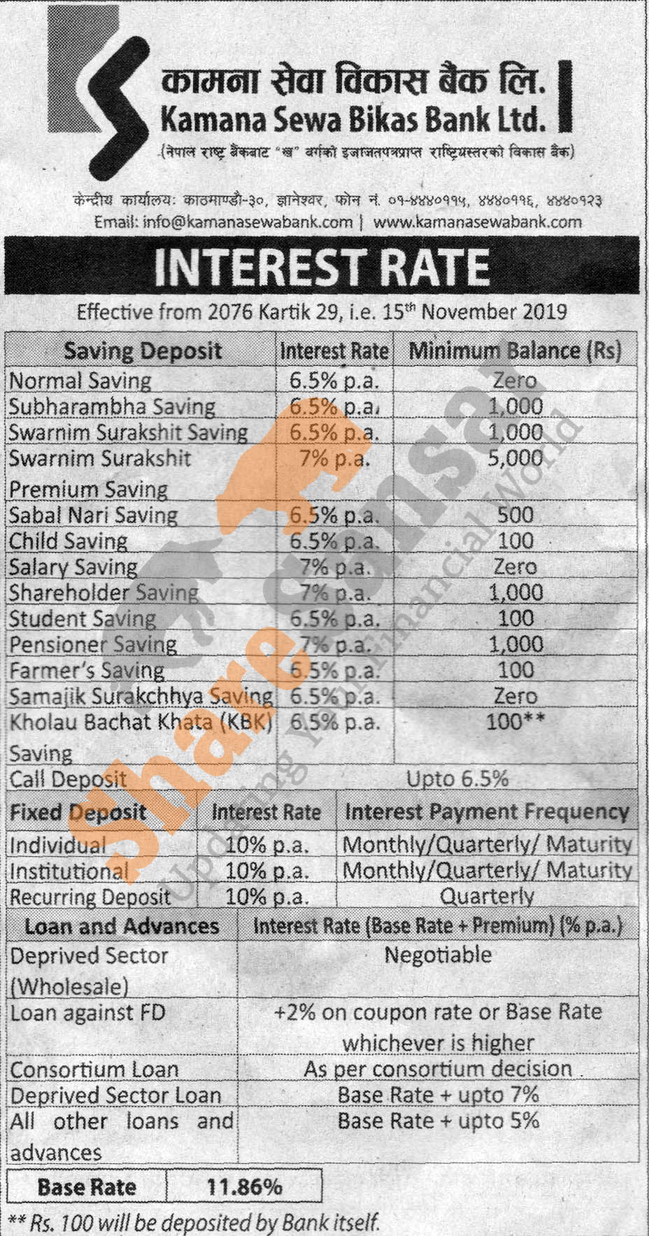 Kamana Sewa Bikas Bank Limited has published a notice regarding new interest rate and its effective from 29th Kartik, 2076.