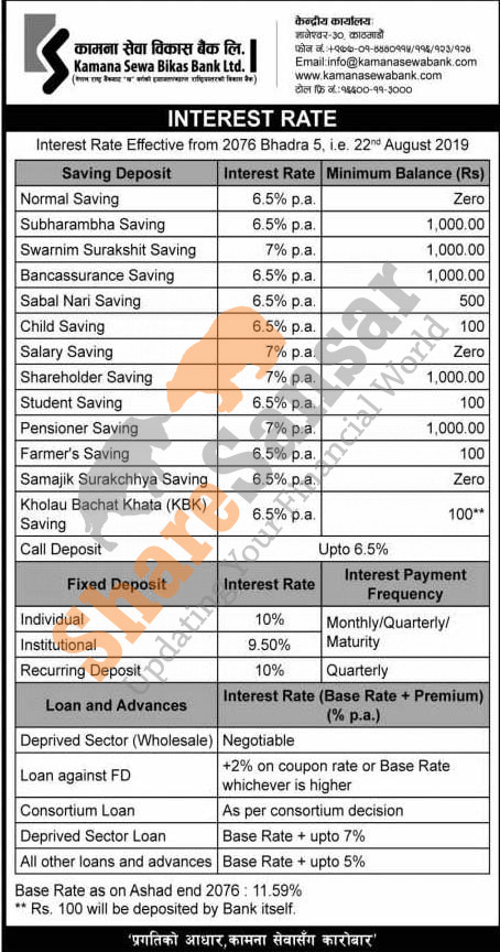 Kamana Sewa Bikas Bank Limited has published a notice regarding new interest rate and its effective from 5th Bhadra, 2076.