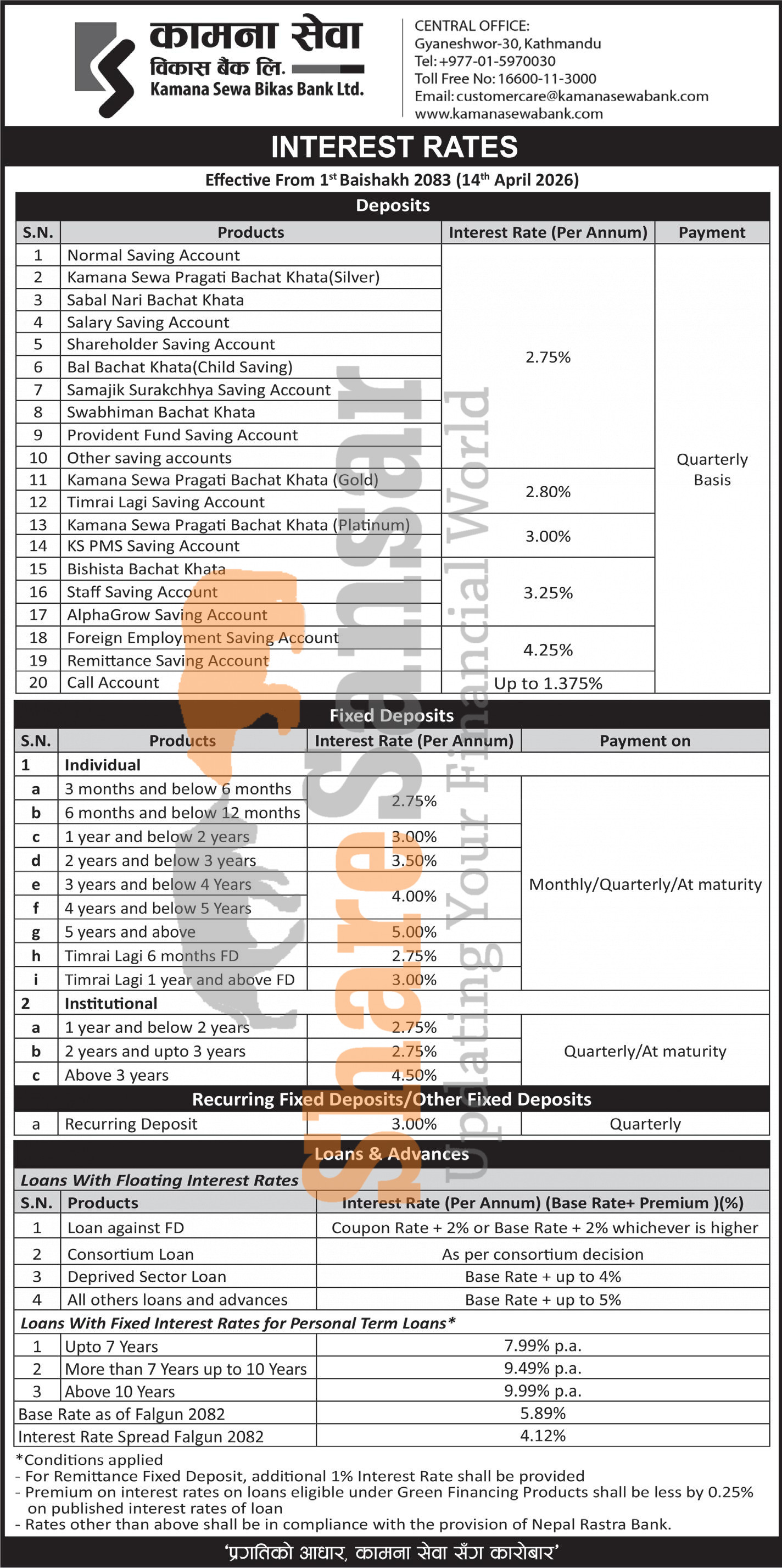 Kamana Sewa Bikas Bank Limited has published a notice regarding the new interest rate for deposit and loan products and it's effective from 1st Baisakh, 2083.