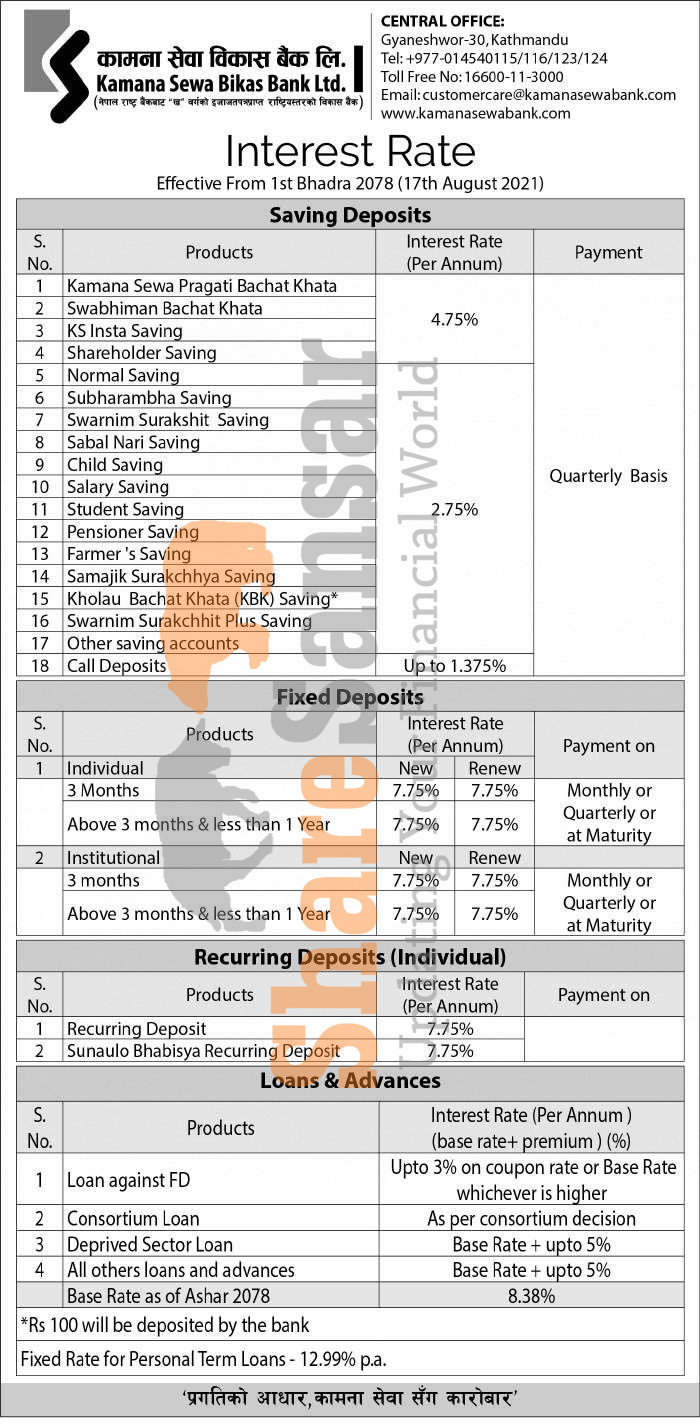 Kamana Sewa Bikas Bank Limited has published a notice regarding the new interest rate for deposit and loan products and it's effective from 1st Bhadra, 2078.