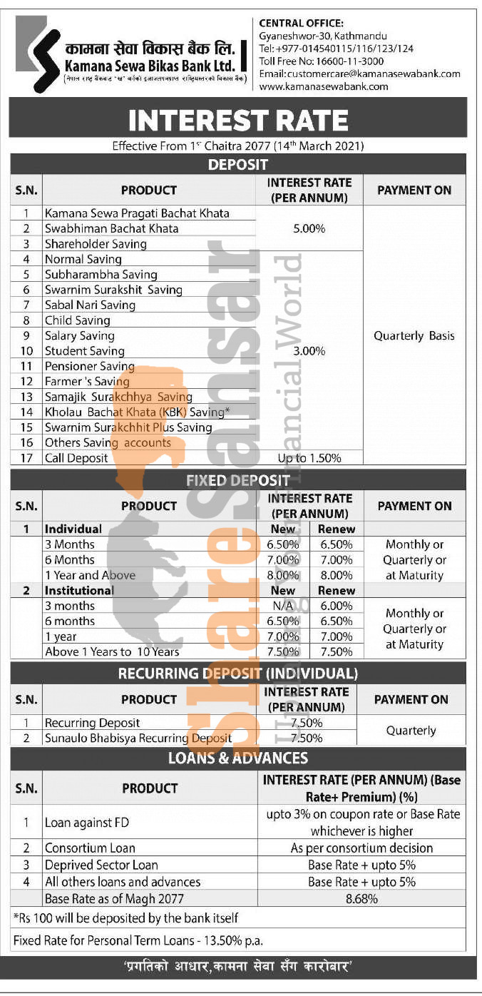Kamana Sewa Bikas Bank Limited has published a notice regarding the new interest rate for deposit and loan products and it's effective from 1st Chaitra, 2077.
