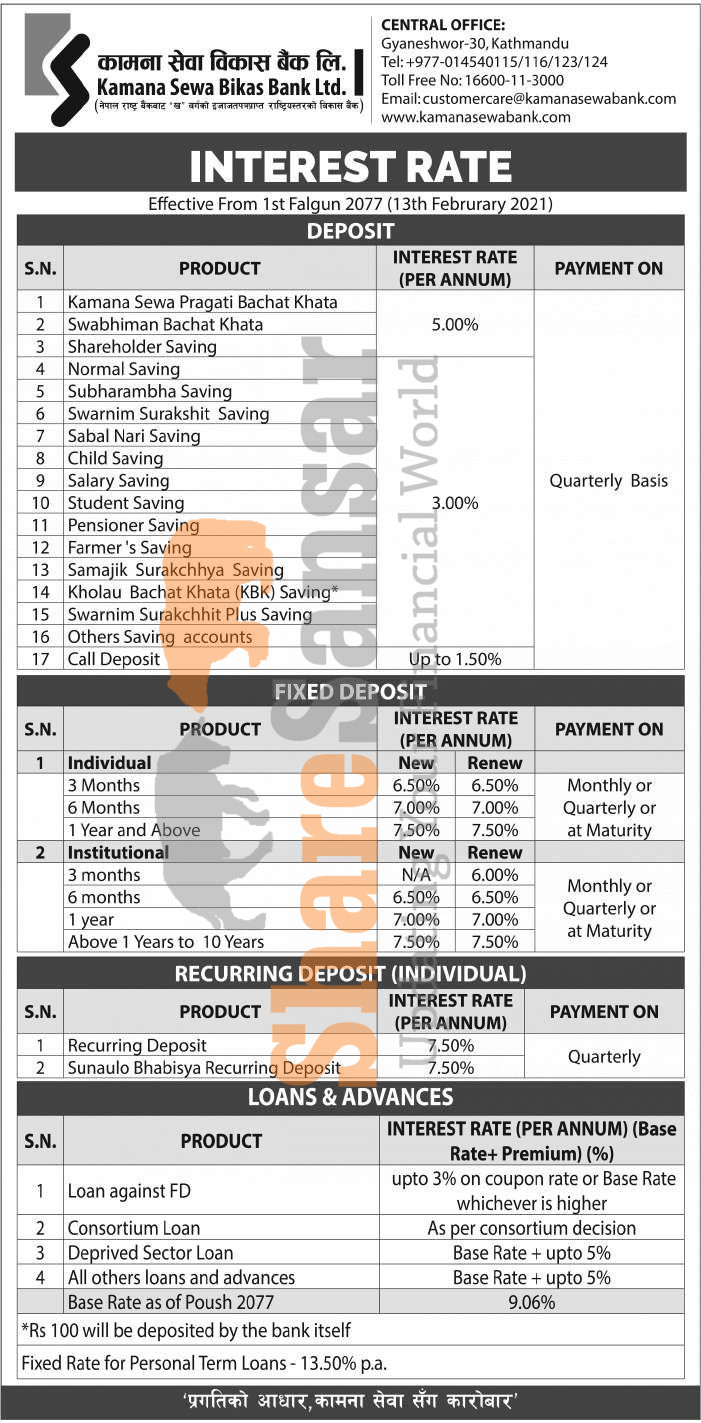 Kamana Sewa Bikas Bank Limited has published a notice regarding the new interest rate for deposit and loan products and it's effective from 1st Falgun, 2077.