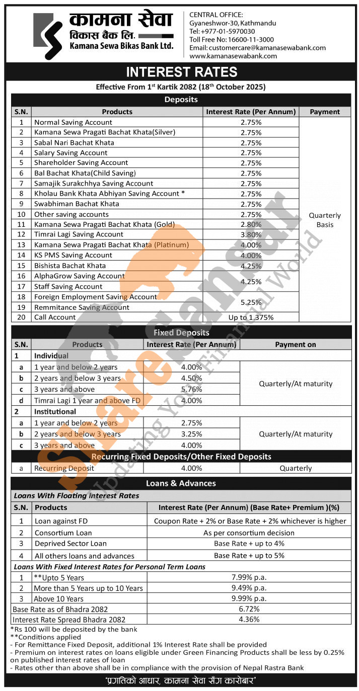 Kamana Sewa Bikas Bank Limited has published a notice regarding the new interest rate for deposit and loan products and it's effective from 1st Kartik, 2082.