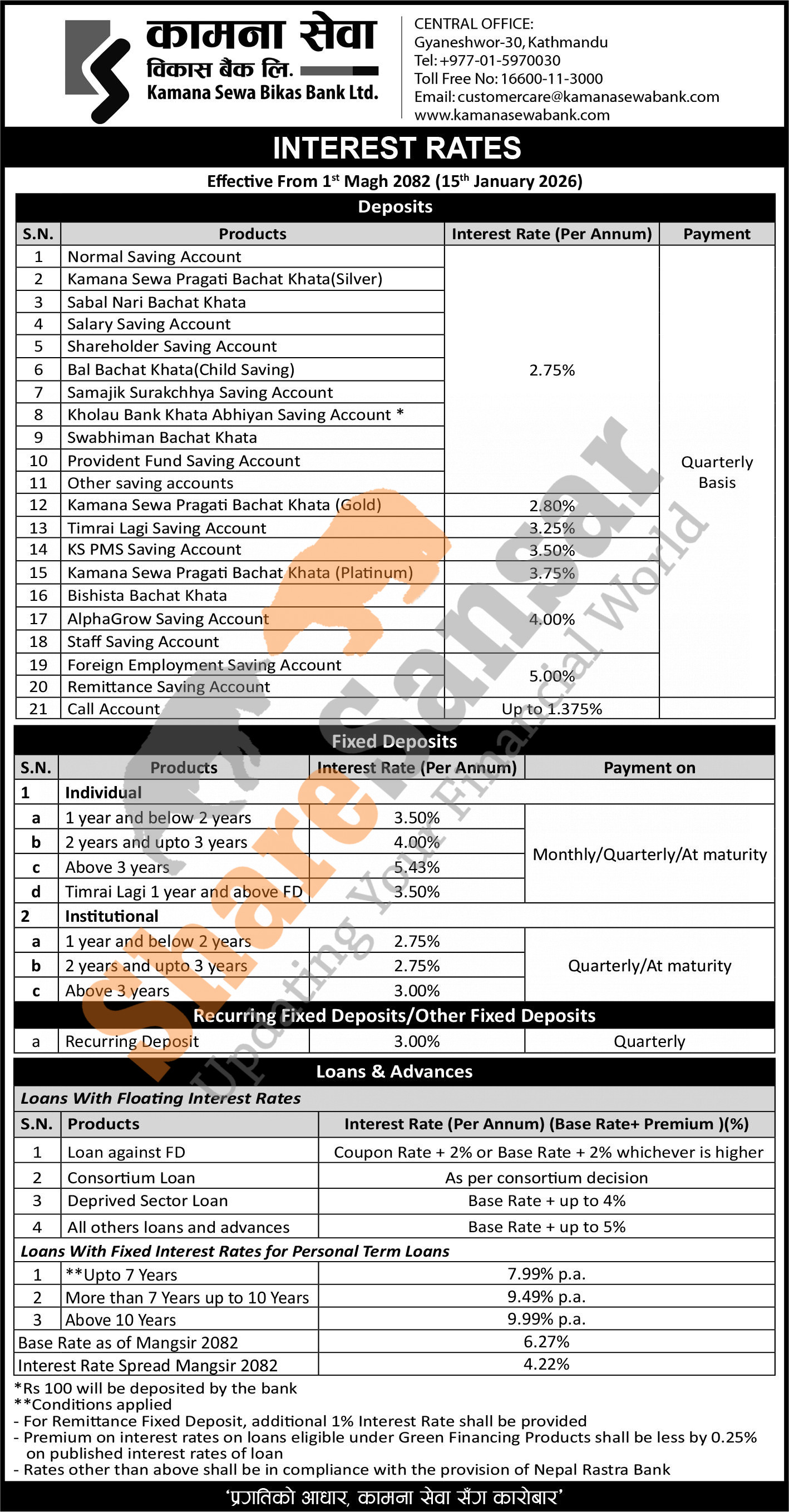 Kamana Sewa Bikas Bank Limited has published a notice regarding the new interest rate for deposit and loan products and it's effective from 1st Magh, 2082.