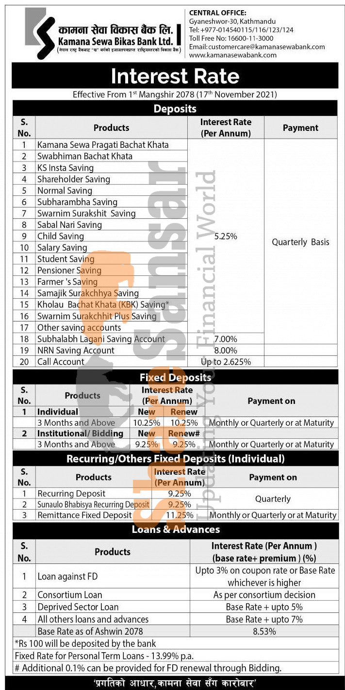 Kamana Sewa Bikas Bank Limited has published a notice regarding the new interest rate for deposit and loan products and it's effective from 1st Mangshir, 2078.